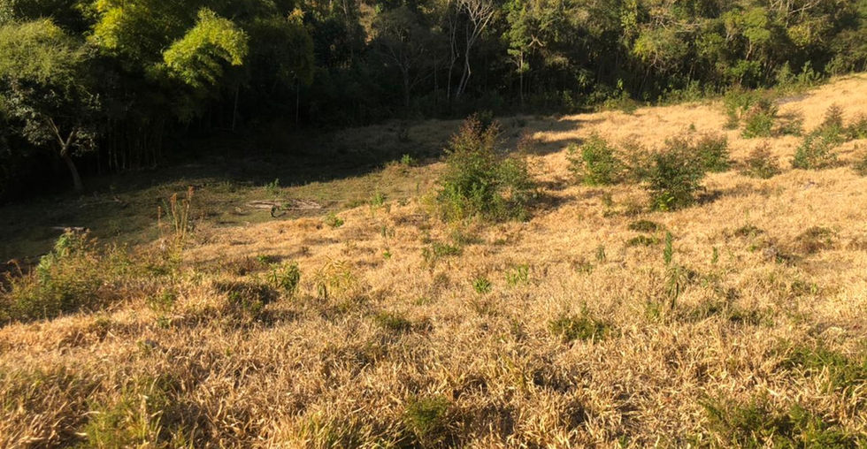 Área completamente cercada, com muitas araucárias e eucaliptos.